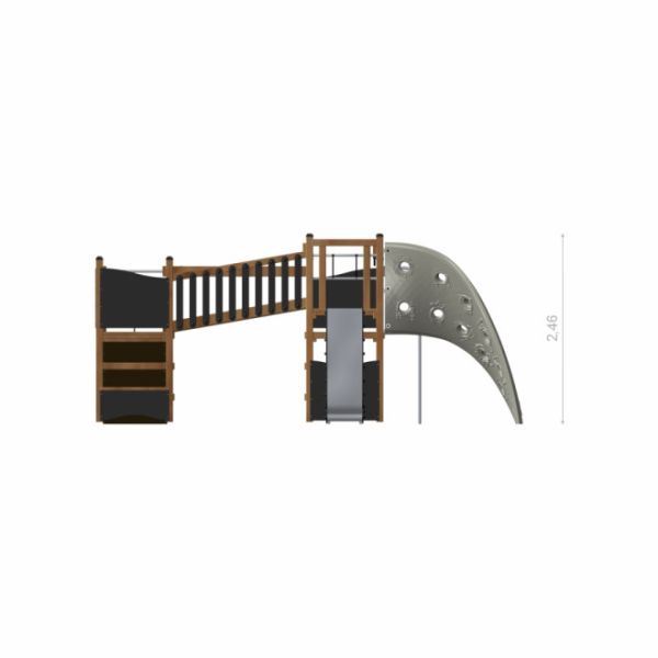 Aztec Natur - Klatretårn med rutsjebane og snoet klatrevæg er ikke kun et legeplads element, men også en kilde til udvikling af fysisk kondition. Børn kan klatre på træbroer, trække sig op ad den snoede klatrevæg, eller glide ned af den spændende rutsjebane. Med en kritisk faldhøjde på 236 cm og en sikkerhedszone på 1036x878 cm, opfylder dette produkt alle nødvendige sikkerhedsstandarder.