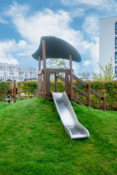 Hekla - Legeplads på bakke – Rutsjebane er ideel til offentlige parker, skoler og daginstitutioner samt private haver, hvor børn i alderen 3+ kan nyde timevis af sjov. Bakketerrænet skaber en naturlig udfordring, og rutsjebanen giver et spændende nedløb, der får hjertet til at banke hurtigere. Dette unikke legemiljø fremmer både leg og læring og opfordrer børn til at udforske deres omgivelser aktivt.