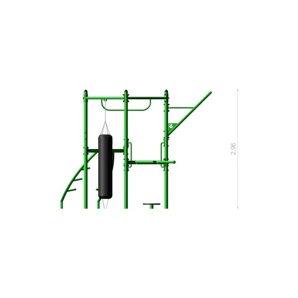 Med en bredde på 376 cm, en længde på 424 cm og en højde på 296 cm, giver Sekskantet træningsudstyr rigelig plads til alsidig træning. Det er designet til brugere over 140 cm i højden og har en kritisk faldhøjde på 296 cm, hvilket sikrer sikkerhed under intense træningssessioner. Der kræves et specifikt faldunderlag for ekstra beskyttelse.