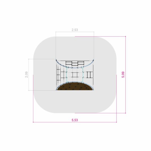 Med mål på 220 cm i bredden, 255 cm i længden og en højde på 110 cm, er Klatreøen i stål – Klatrestativ både kompakt og rummelig. Den kritiske faldhøjde på 110 cm sikrer sikkerheden, og den påkrævede sikkerhedszone på 555x520 cm understøtter nem installation og integrering i eksisterende legerum.