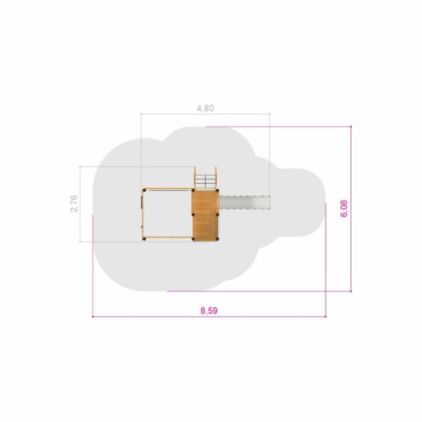 Med dimensioner på 276 cm i bredde, 480 cm i længde og 216 cm i højde, samt en kritisk faldhøjde på 205 cm, er sikkerheden prioriteret i dette design. Sikkerhedszonen på 859x608 cm sikrer, at der er tilstrækkeligt med plads til leg og bevægelse, mens det nødvendige faldunderlag beskytter mod eventuelle fald.