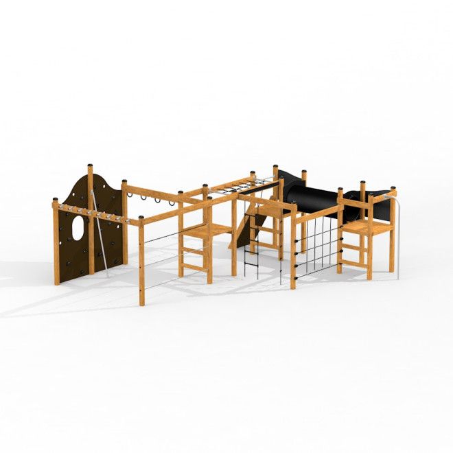 Motorrikken Natur - Klatretårn med tunnel og klatrevæg inkluderer en klatreplatform, en lang tunnel, brandmandsstang samt et rigt udvalg af klatrenet og stiger. Disse elementer er specielt designet til at fremme børns motoriske færdigheder og sociale interaktion. Hvert materiale anvendt i konstruktionen er valgt med nøje omhu - fra lærketræ, rustfrit stål, og galvaniseret stål, til lidt og blødt polypropylen reb, skridsikkert, vandfast krydsfiner, en rustfrit stål kæde, HDPE, og gummi.