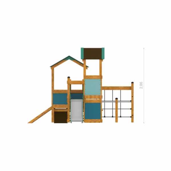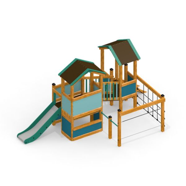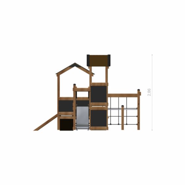 Legetårnene, med deres spidse tage, beskytter børnene mod solens stråler, regn og vind, mens de leger. De skridsikre og vandtætte platforme af krydsfiner garanterer sikkerheden, mens børnene udforsker og leger i deres eget eventyrlige univers. Med en gulvhøjde på 55-90 cm og en kritisk faldhøjde på 145 cm, er dette legepladsudstyr ideelt til børn fra 3 år og opefter.