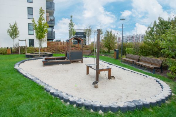 Sand- og vandleg bord er udstyret med to vaske i rustfrit stål, som giver en holdbar og hygiejnisk oplevelse. Legebordet inkluderer en robust træpæl med træksystem og to spande, hvoraf den ene er fastgjort med rustfri stålkæder og kan nemt trækkes op og ned. Dette stimulerer børns motorik og koordination på en underholdende måde.